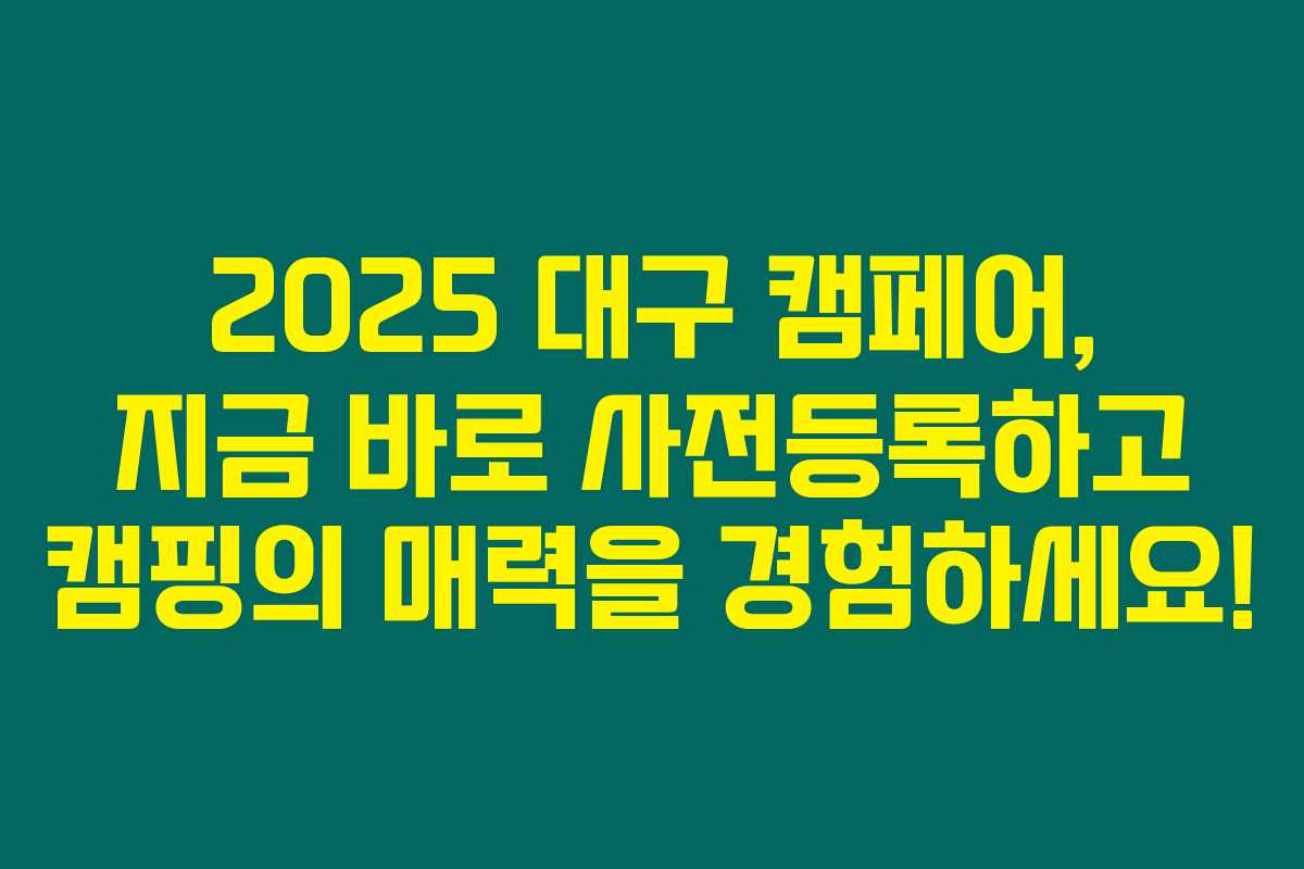 2025 대구 캠페어에서는 캠핑의 모든 매력을 느낄 수 있는 기회를 가져보세요! 모든 가족 단위 관람객이 함께 즐길 수 있는 프로그램이 마련되어 있어, 더욱 의미 있는 경험이 될 것입니다. 여러분도 지금 바로 사전등록하고 캠핑의 매력을 만끽해보세요! 잊지 마세요, 캠핑의 모든 것을 한자리에서 만날 수 있는 2025 대구 캠페어를 놓치지 마세요.