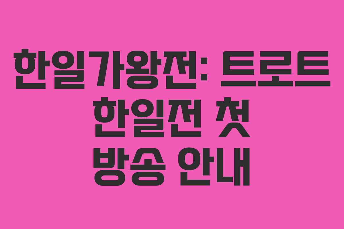 2024년 4월 2일, 한국과 일본의 트로트 국가대표들이 펼치는 한일가왕전이 첫 방송됩니다. 이 프로그램은 한국의 트로트 국가대표 TOP7과 일본의 트롯걸인재팬 TOP7이 대결하는 세계 최초의 트로트 한일전으로, 많은 기대를 모으고 있습니다.