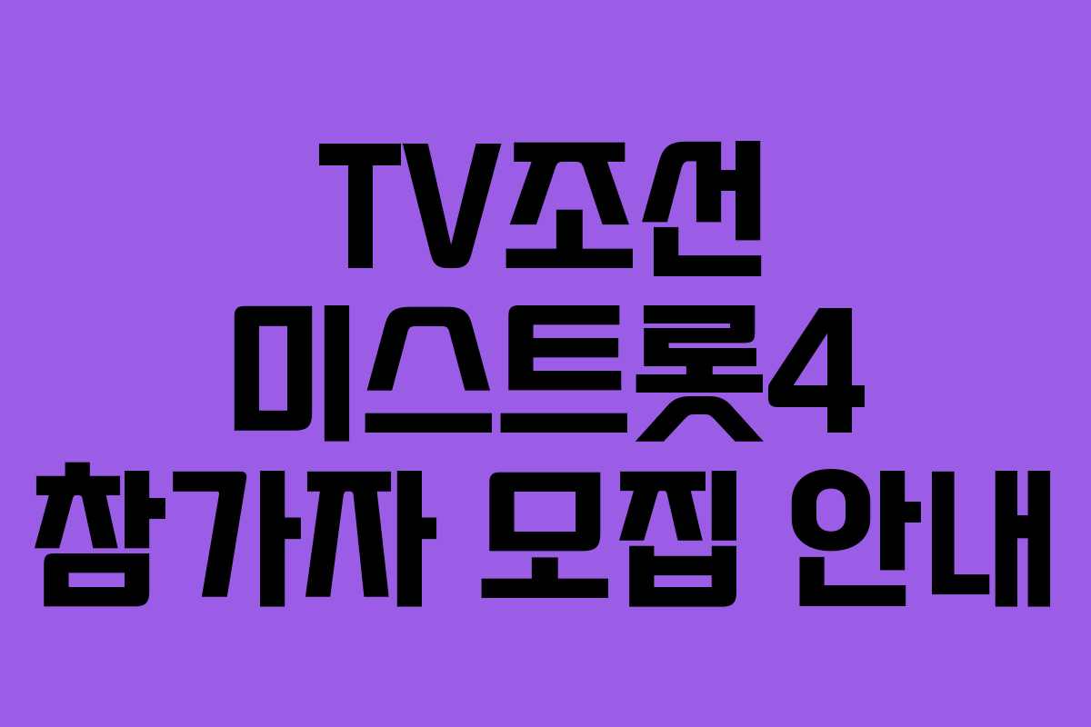 TV조선의 인기 프로그램인 미스트롯4의 참가자 모집이 시작되었습니다. 이번 오디션은 트로트를 사랑하는 모든 여성에게 열려 있으며, 나이와 경력에 상관없이 도전할 수 있는 기회입니다. 신청 방법과 기간, 자격 조건 등을 자세히 알아보겠습니다.